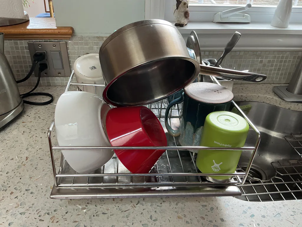 A dish drainer that works well and has no plastic parts on the main components. No plastic mat resting on the counter and accumulating water underneath. Plates and bowls are kept upper right. The only think it’s missing are a couple of side hooks for glasses.