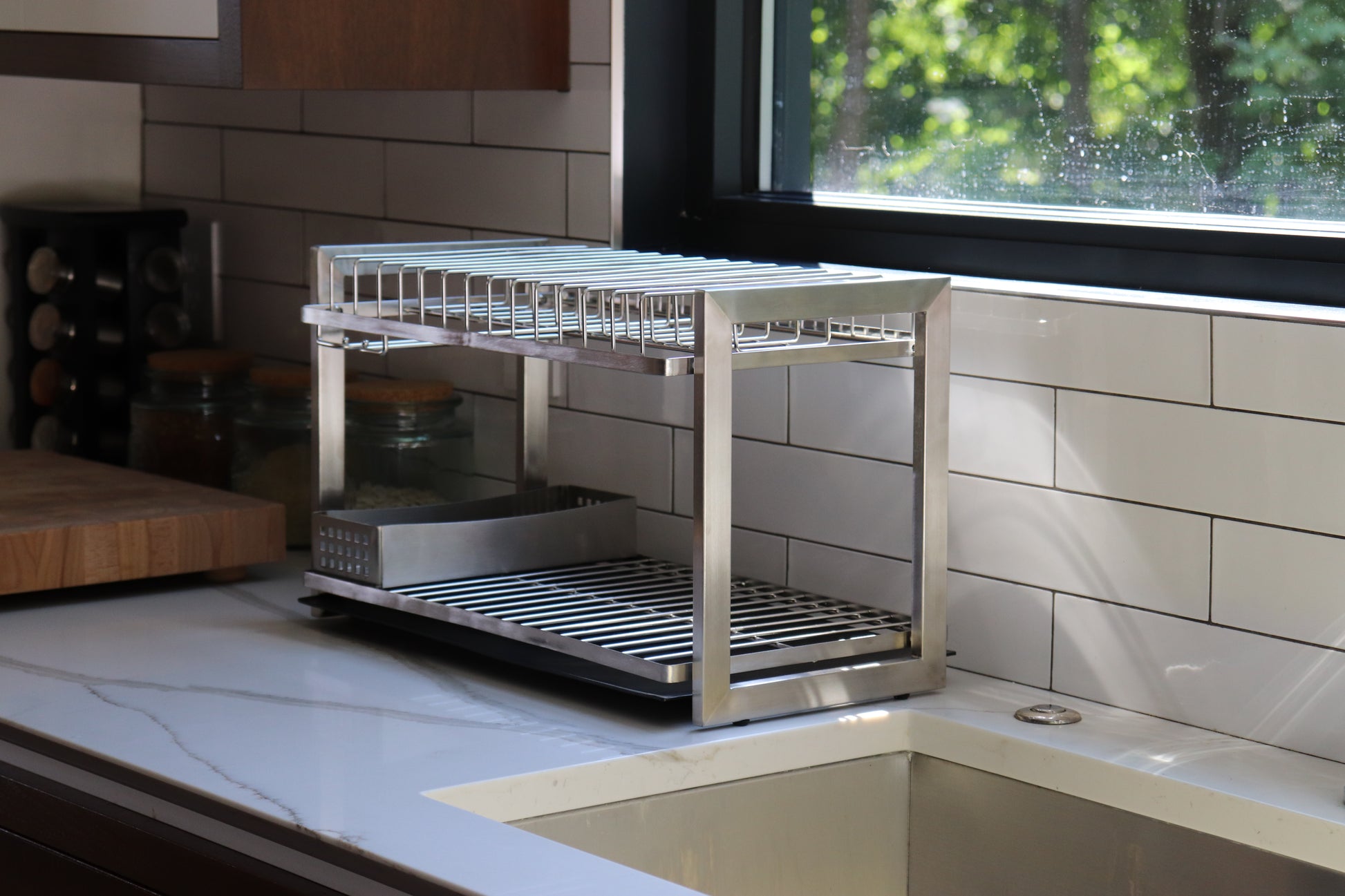 This is the smaller version of the Patagonia dish rack with only 2-tiers. It is made of high quality stainless steel. Unlike our self draining Rohan dish, which needs to be placed next to the sink, this one can be kept anywhere on the counter since it uses a tray to catch water. This tray can be easily slid out from under the frame to discard the water. The Patagonia 2-tier stainless steel dish rack drainer comes with two sturdy end frames made of rectangular stainless steel tubing and two racks. The plate rack is the top most one and takes plates, pots and pans and even wine glasses on its bottom side. The bottom rack can be used for tumblers, bowls and pretty much anything you would like to have dried. The Patagonia dish rack comes with the Palena utensil tray.