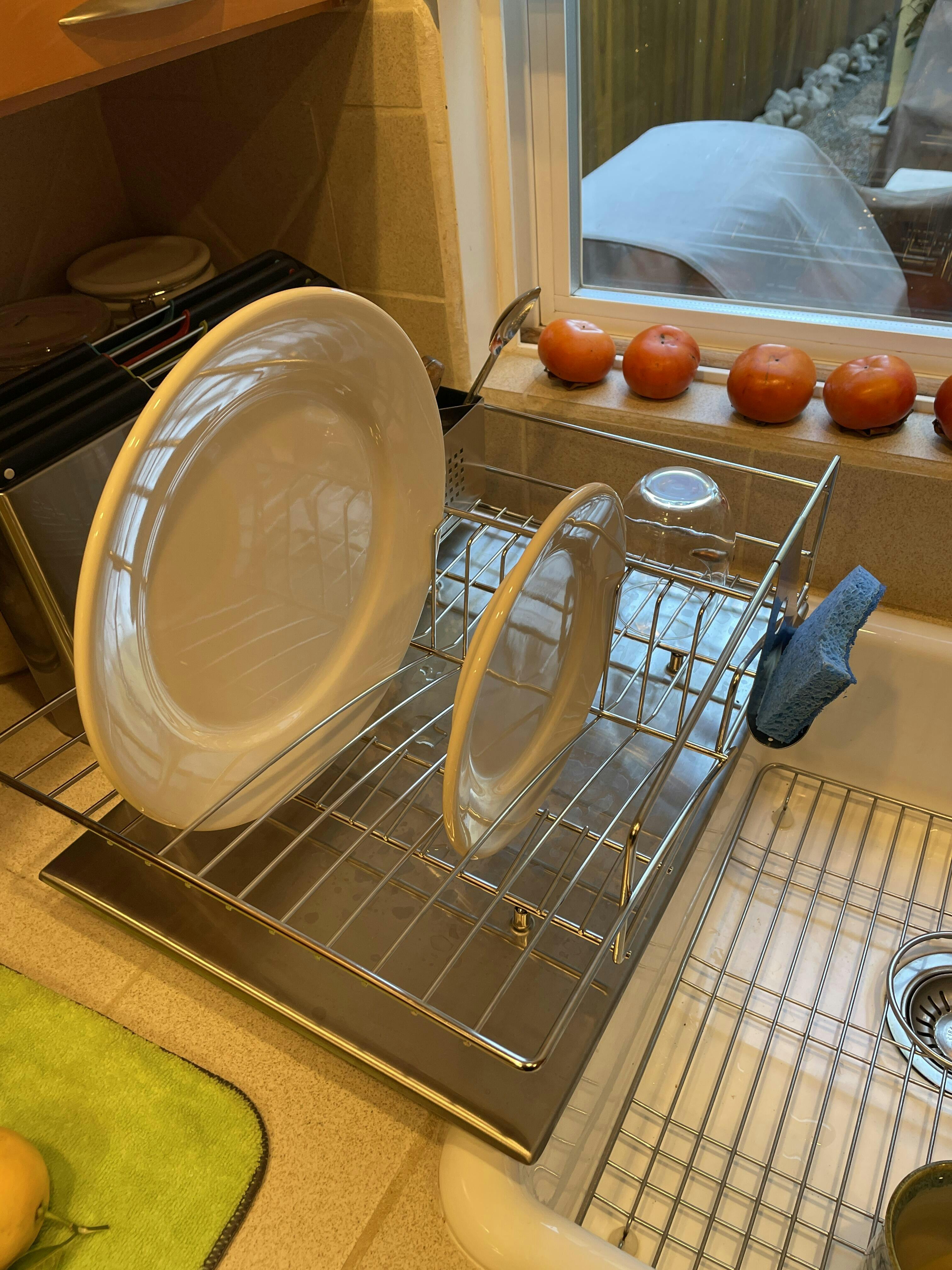 I’ve spent years fighting with dish racks that get water all over the place and this is a miracle worker. it takes up minimal space, holds so much, and truly funnels the water right into the sink. I wish I bought this three years ago!!