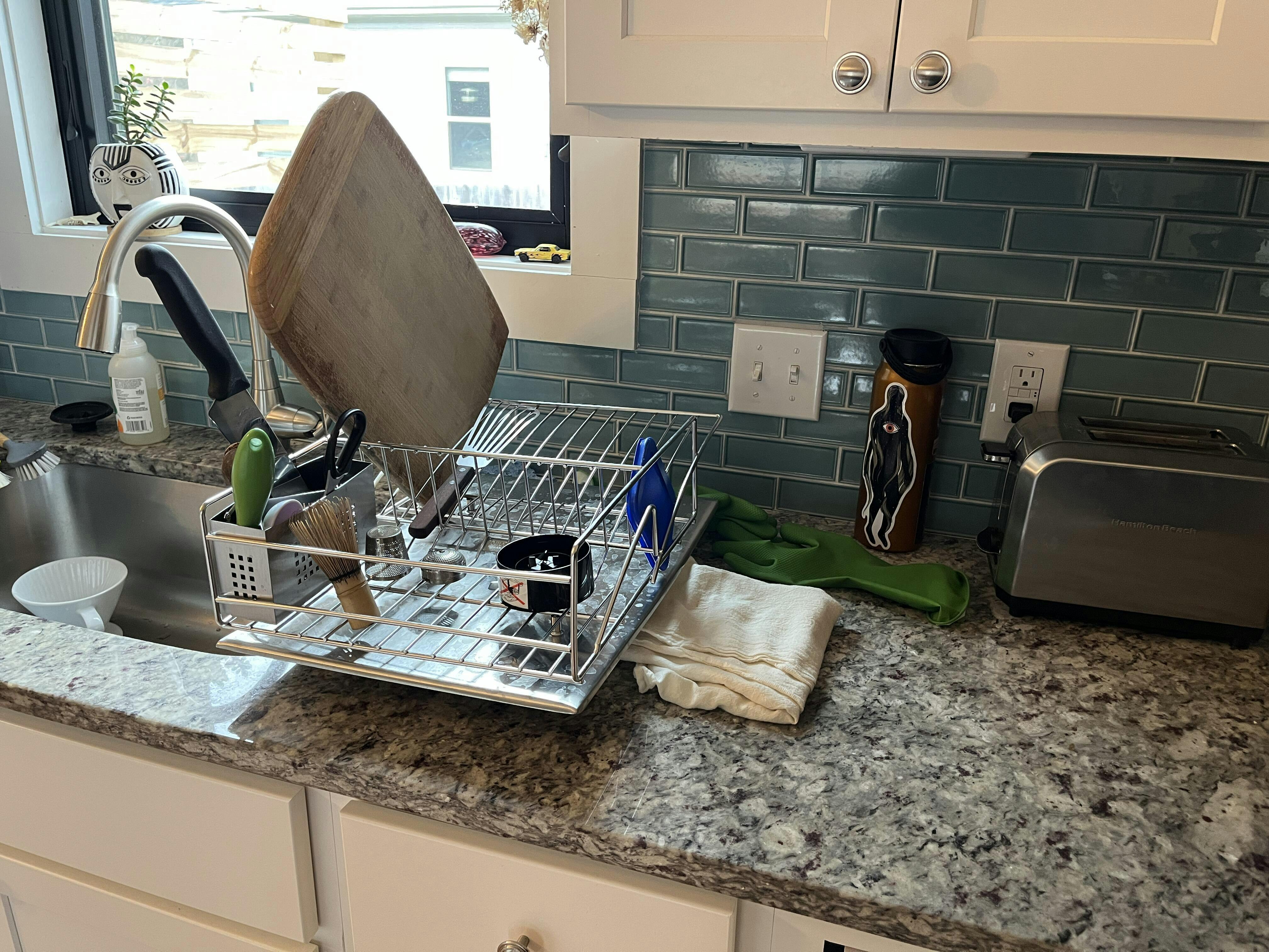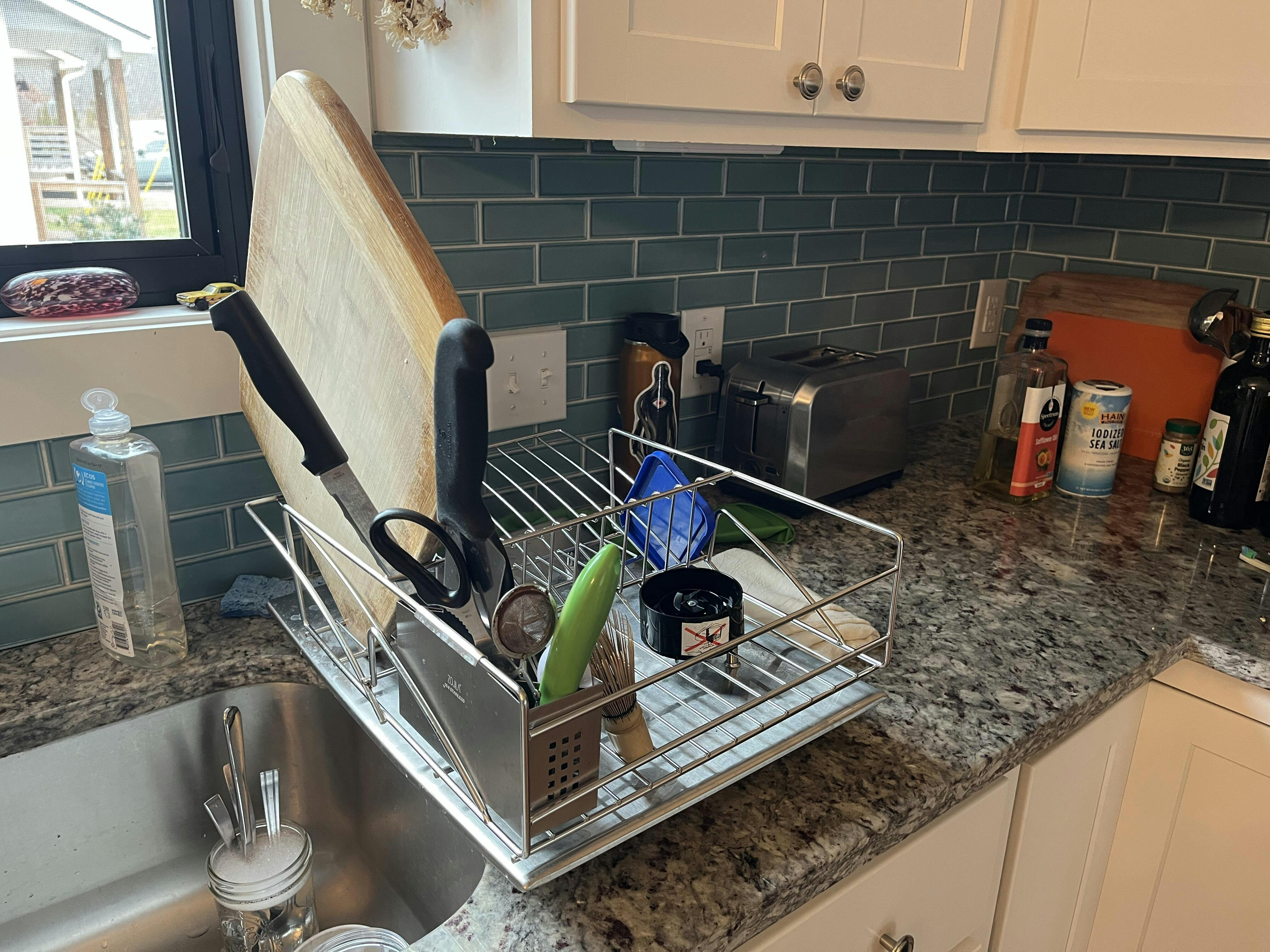 I’ve spent years fighting with dish racks that get water all over the place and this is a miracle worker. it takes up minimal space, holds so much, and truly funnels the water right into the sink. I wish I bought this three years ago!!